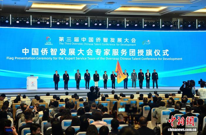 图为落幕式上举办“华夏侨智成长年夜会人人效劳团”受旗典礼。中新社记者 弛斌 摄