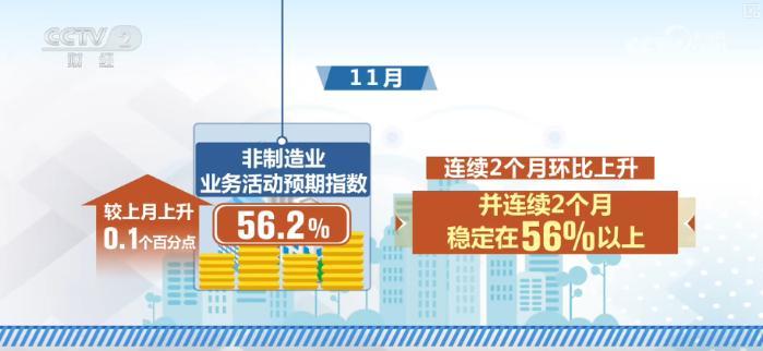 11月,非制作业生意举动预期指数为56.2%,较上月回升0.1个百分面,陆续2个月环比高涨,并继续2个月波动正在56%以上。
